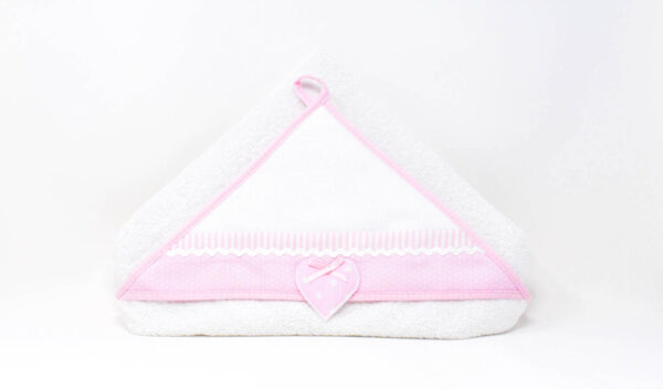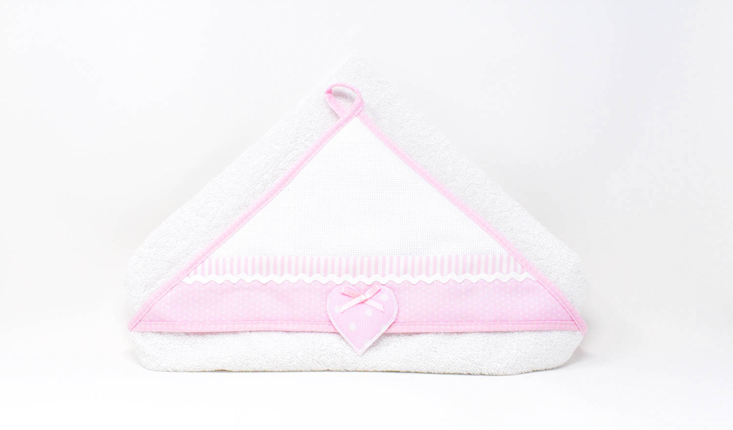Accappatoio in morbida spugna a triangolo con cappuccio ed applicazione, inserto in tela aida sul cappuccio da ricamare a punto croce, per rendere unico e speciale il momento del bagnetto. Ideale per neonati da 0 a 9 mesi.
