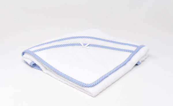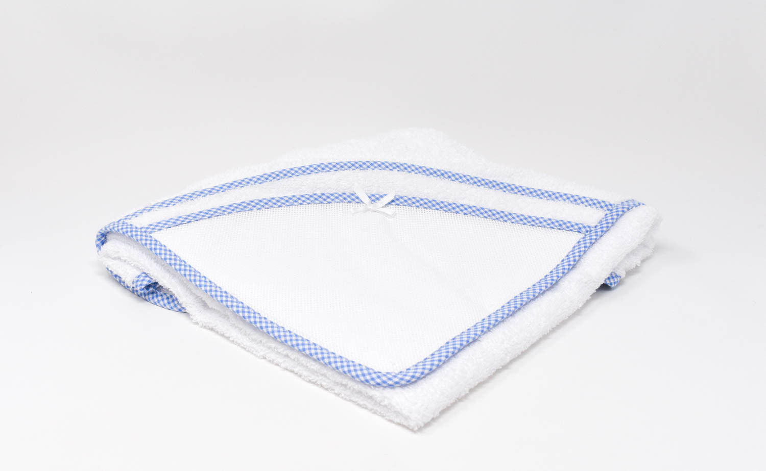 Accappatoio in morbida spugna a triangolo con cappuccio, inserti in tela aida 55 fori sul cappuccio e taschino a forma di cuore da ricamare a punto croce, per rendere unico e speciale il momento del bagnetto. Ideale per neonati da 0 a 9 mesi.