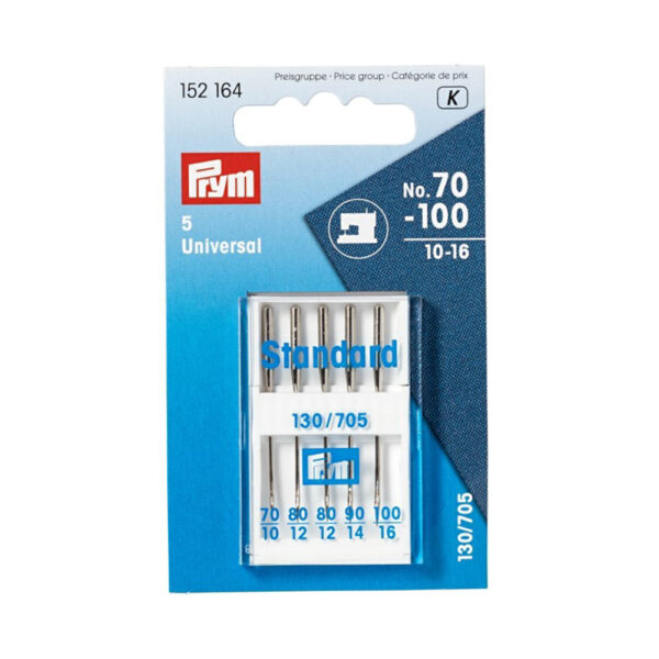 Aghi universali per macchina da cucire con punta standard per tessuti naturali e sintetici. La confezione è composta da n. 5 aghi, assortita con le seguenti misure: