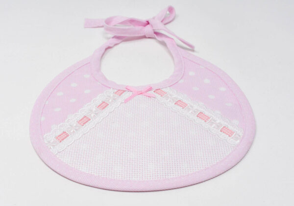Bavaglino di piquet a fantasia pois disponibile rosa o celeste con passanastro di San Gallo, nastrino a scacchetti e fiocchetto di raso, con inserto in tela aida per essere personalizzato a punto croce. E’ possibile la personalizzazione su richiesta.