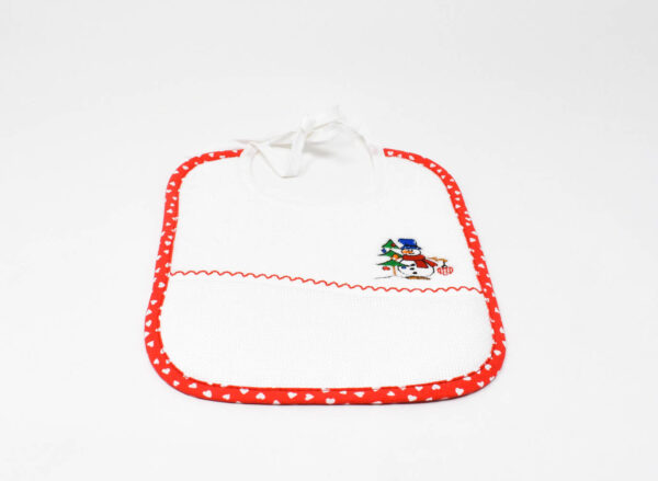 Bavaglino neonato natalizio in spugna profilato in sbiego di cotone rosso a cuoricini e laccetto bianco, applicazioni ricamate a macchina natalizie, con inserto in tela aida per essere personalizzato a punto croce. E’ possibile la personalizzaione su richiesta.