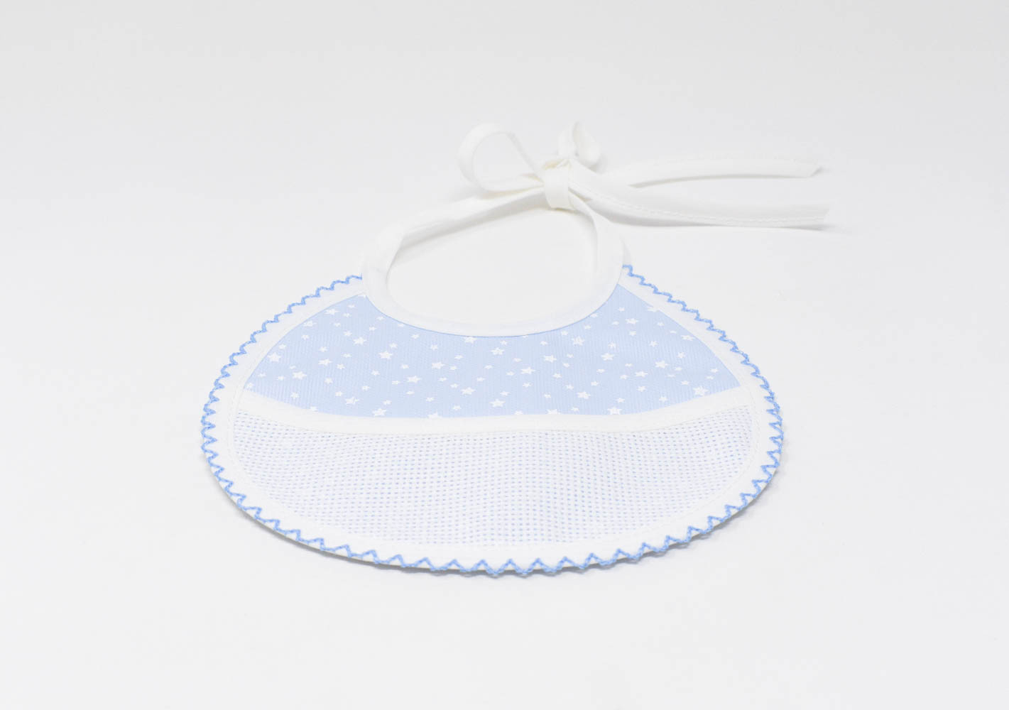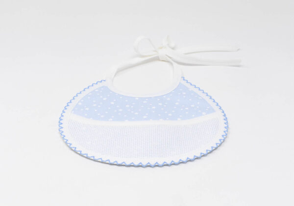 Bavaglino di piquet con stelline stampate, disponibile rosa, celeste ed ecrù, con inserto in tela aida per essere personalizzato a punto croce. E’ possibile la personalizzazione su richiesta.