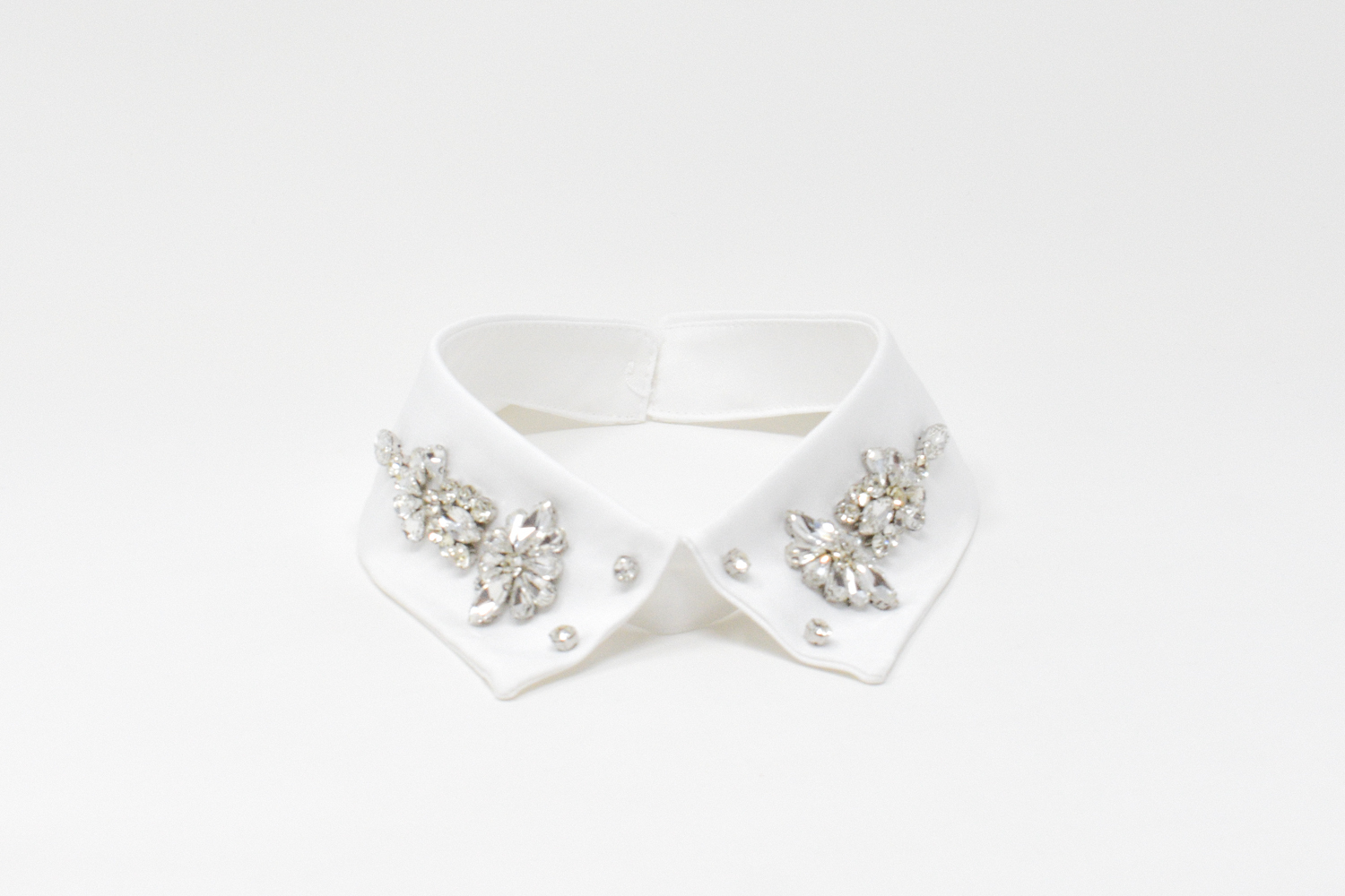 Colletto staccabile bianco in cotone con applicazioni cucite in strass, allacciatura retro con bottoncino perlina bianca. Adatto per impreziosire maglie, abiti, cardigan.