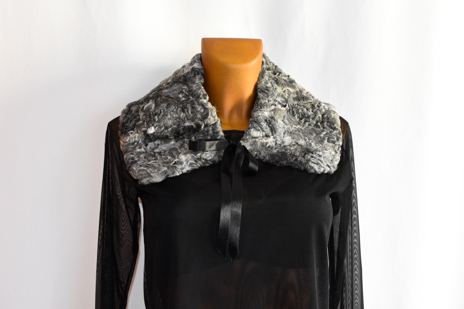 Collo in vera pelliccia astracan foderato in raso, colore grigio, modello collo camicia, misura del collo cm 0,66 con nastro di raso per essere staccato e posizionato su più capi