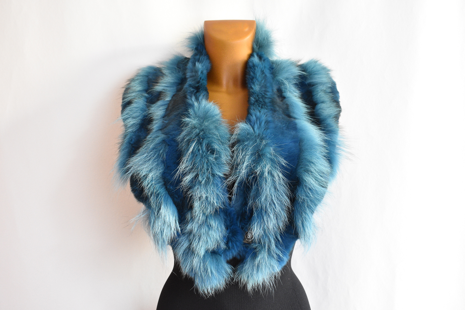 Collo in vera pelliccia di volpe e lapin foderato in stoffa, colore petrolio, modello sciallato, misura del collo cm 110 con pratici automatici per modificare la forma da sciallato a coprispalla o viceversa ed essere staccato e posizionato su più capi