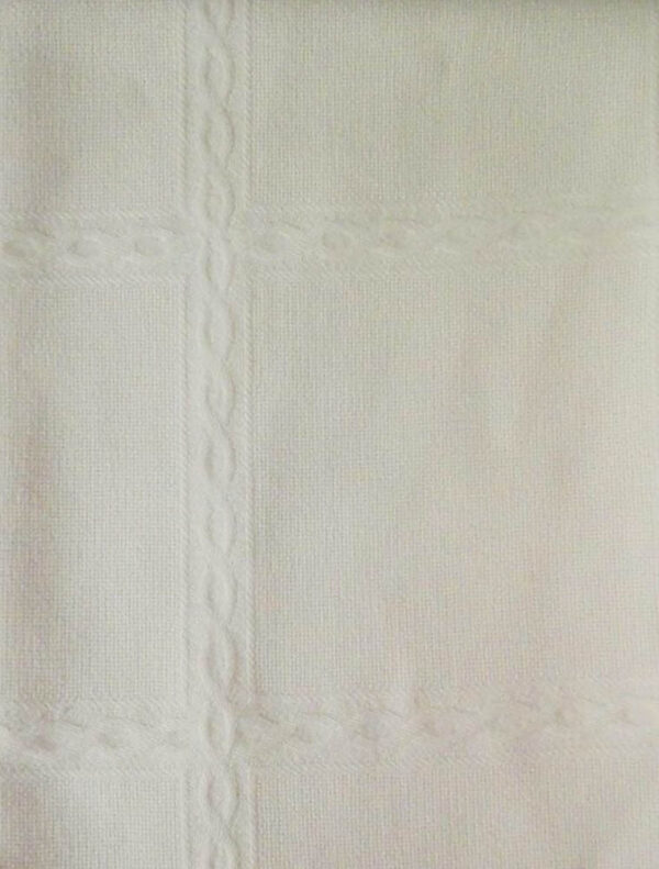 Taglio in tela aida di lana merinos 100% con quadri di cm 20 x 20 color latte da rifinire, la tela aida in lana è realizzata appositamente per il punto croce. La sua tessitura precisa forma un quadrettato che permette di guidare il passaggio dell’ago e di ottenere facilmente delle crocette nette e regolari. La trama è regolare e quindi facilmente lavorabile anche da principianti e in 10 cm si possono contare circa 50 quadretti: questo permette di calcolare le dimensioni dello schema direttamente sulla tela senza alcuna difficoltà, è una misura standard che consente una lavorazione a tre fili con il filato Moulinè. Indicato per realizzare copertine per carrozzina è una pesantezza giusta sia per la mezza stagione che per l’inverno.