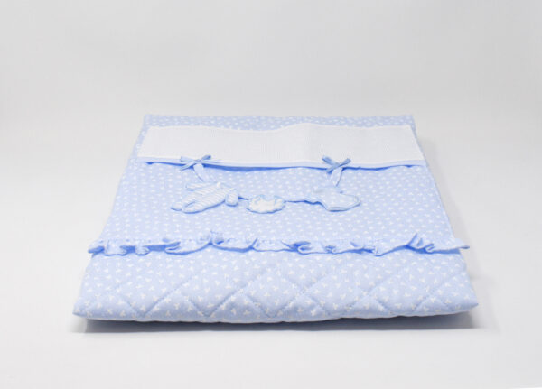 Copertina per carrozzina leggermente imbottita, calda e con morbido interno in ovatta, con apertura per inserire imbottitura invernale. Tasta con applicazioni e inserto in tela aida per essere ricamata e personalizzata a punto croce. Composizione 100% cotone. Ideale per le stagioni autunno, inverno e primavera.