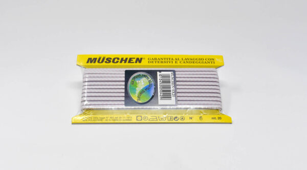 Elastico piatto colore bianco con righina rossa ideale per lavaggi in lavatrice anche ad alte temperature e candeggina, molto resistente alto 4 mm adatto per abbigliamento, indumenti da lavoro, maschere, scarpe. La confezione è da 20 mt.