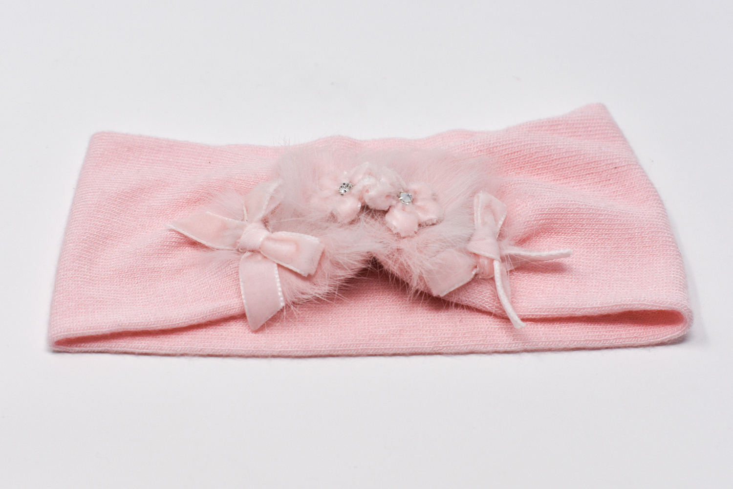 Fascetta neonata rosa realizzata in morbida ed elasticizzata maglina di lana con applicazioni fiocchi e fiori di velluto, strass e pon pon pelliccia