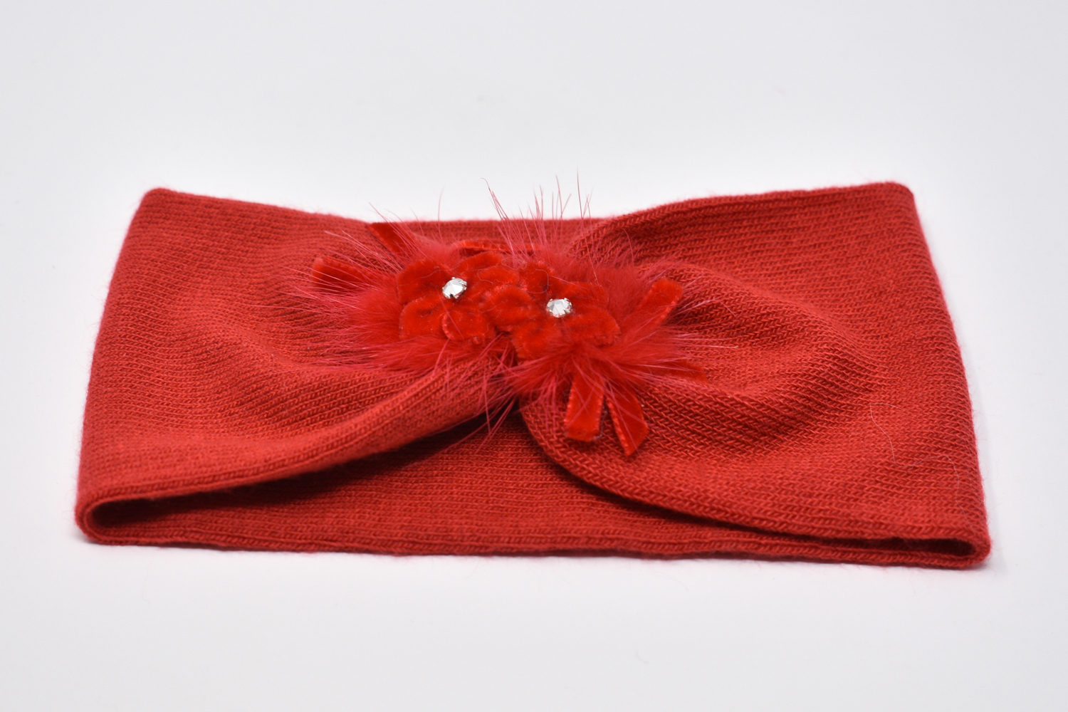 Fascetta neonata rossa realizzata in morbida ed elasticizzata maglina di lana con applicazioni fiori e fiocchetti di velluto, strass e pon pon di pelliccia.