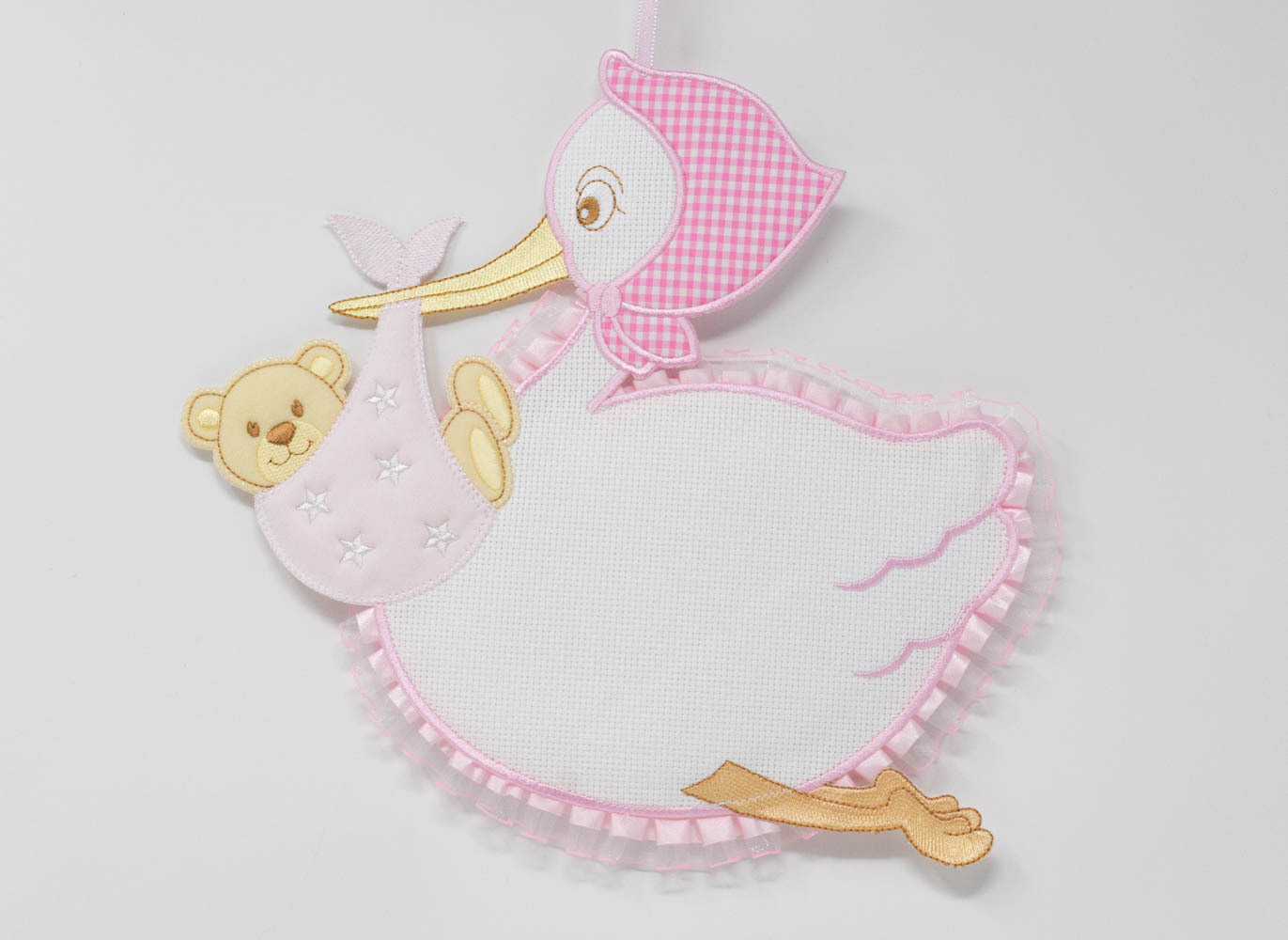 Fiocco nascita cicogna con orsetto, disponibile nei colori rosa o celeste con tela aida da personalizzare a punto croce, contornato con rouge in raso ed organza, con pratico nastro di raso superiore per essere appeso. E’ possibile anche personalizzarlo su richiesta.