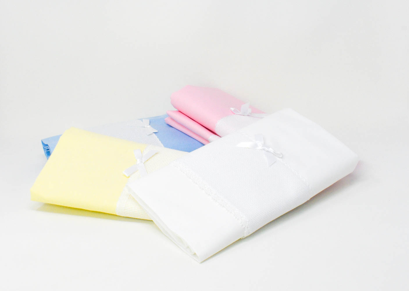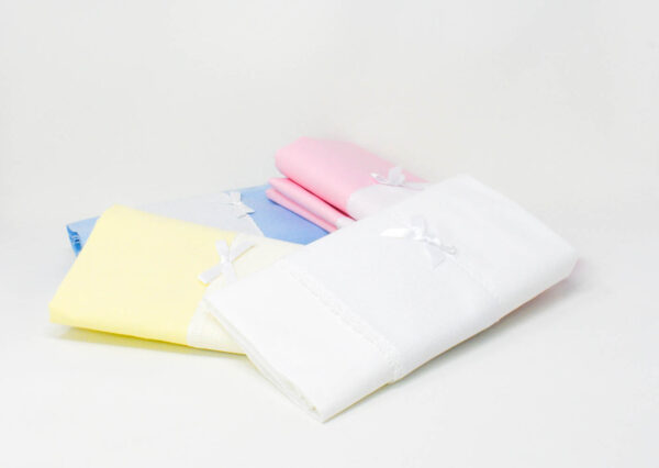 Lenzuolino in cotone 100%, materiale ipoallergenico e morbido, che non crea arrossamento o irritazione a contatto con la delicata pelle del vostro bambino. Con inserto in tela aida per essere ricamato a Punto Croce e merletto in cotone bianco. La confezione comprende un lenzuolo per sopra, un lenzuolo per sotto con angoli e la federa.
