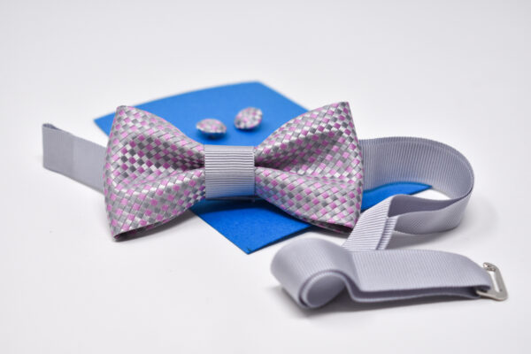 Papillon bimbo realizzato in seta a fantasia a sfondo con due bottoncini foderati da polso coordinati e cinturino regolabile