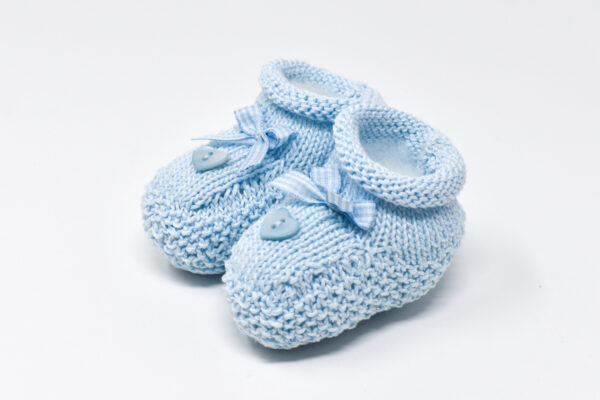 Scarpina neonato celeste realizzata in morbido filato 100% cotone decorata con applicazione fiocchetto vichy bianco e celeste e cuore in madreperla