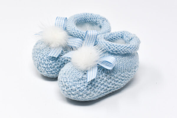 Scarpina neonato celeste realizzata in morbida lana merinos 100% con applicazione fiocchetto vichy bianco e celeste e pon pon di pelliccia bianco