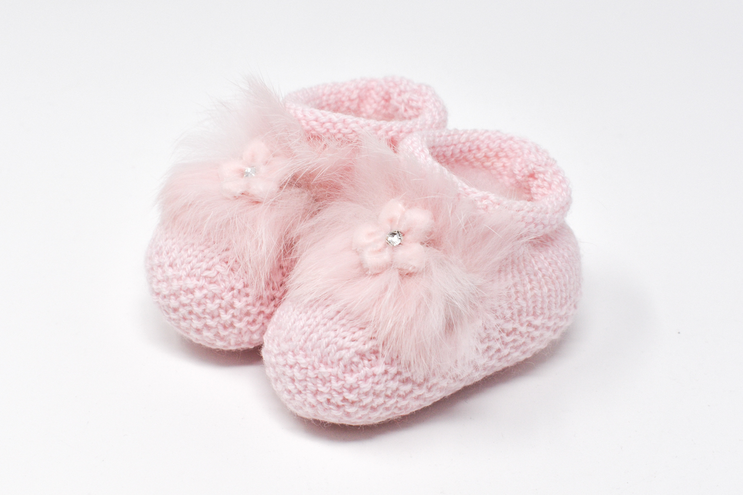 Scarpina bimba realizzata in morbida lana merinos 100% decorata con applicazione fiocco di velluto, strass e pelliccia