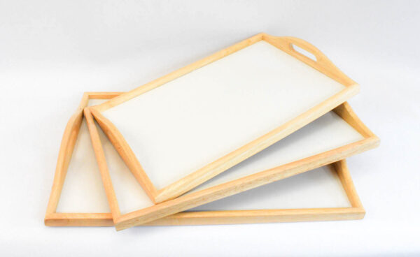 Kit di vassoi in legno naturale con manici, il kit è composto da tre vassoi di misure diverse. Il più grande misura esternamente 43 x 30,5 cm e internamente 41 x 28,5 cm. Il medio misura esternamente 41,5 x 28 cm e internamente 38,5 x 25,5 cm. Il più piccolo misura esternamente 38 x 25 cm e internamente 35,5 x 23 cm. Adatti per lavori di hobbistica come uncinetto, punto croce, pittura, decoupage, ricamo. Senza vetro superiore.